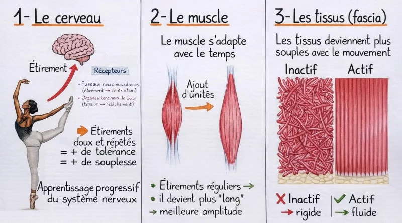 Contrairement à ce qu’on croyait dans les années 90, ce n’est pas seulement « allonger le muscle ». C’est surtout une adaptation neurologique et tissulaire, les gains les plus rapides viennent d’une diminution de la sensibilité nerveuse (raideur musculaire) et d’une meilleure tolérance à l’étirement.